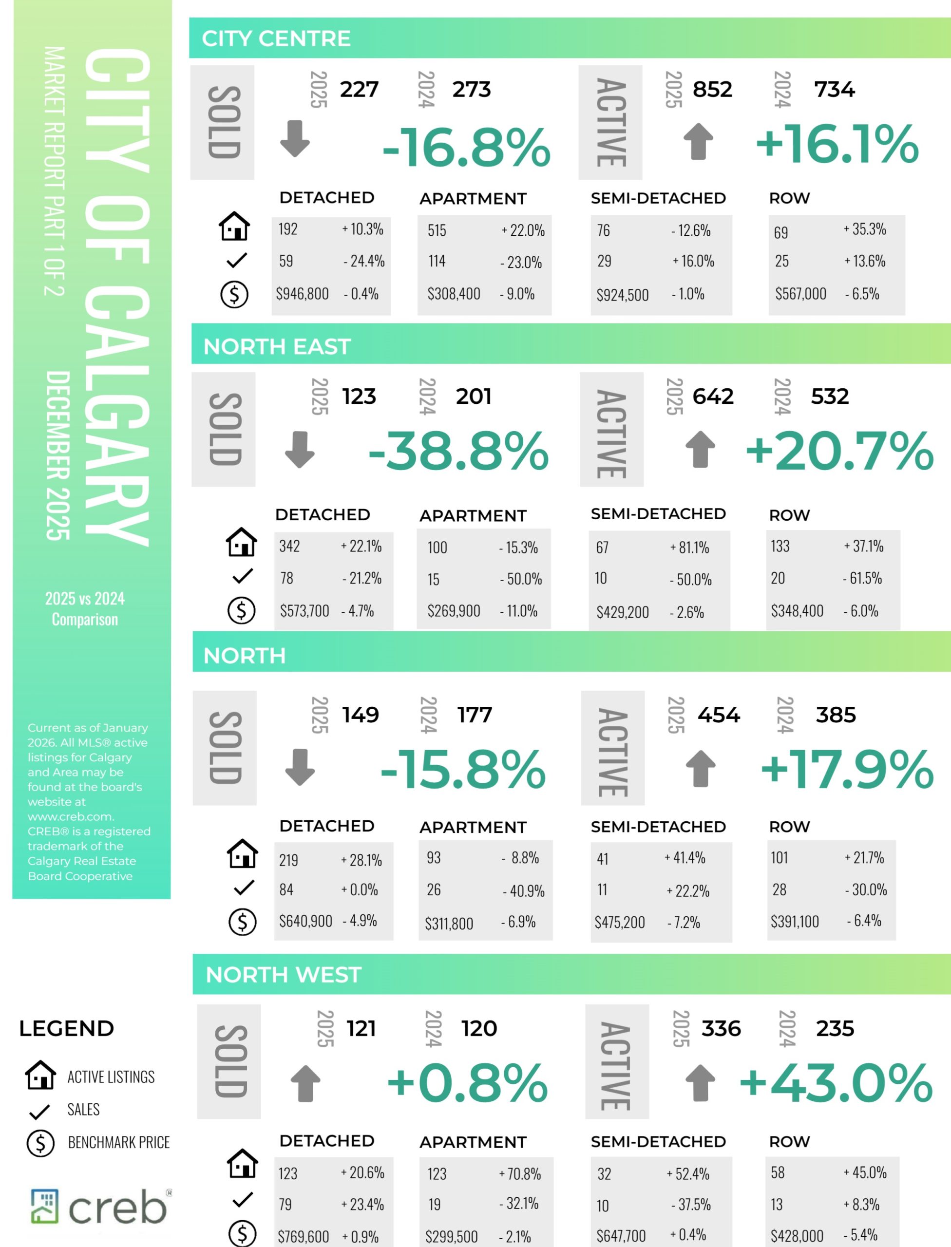 “Supply levels were expected to rise in 2025. However, the growth was higher than expected especially for apartment condominium and row homes. This weighed on prices in those sectors enough to offset the annual gains reported for both detached and semi-detached homes,” said Ann-Marie Lurie, CREB®’s Chief Economist. “Adjustments in both supply and demand varied across the city, with pockets of the market continuing to experience seller’s market conditions versus some areas where the conditions favoured the buyer. This resulted in different price trends based on location, price range and property type.”